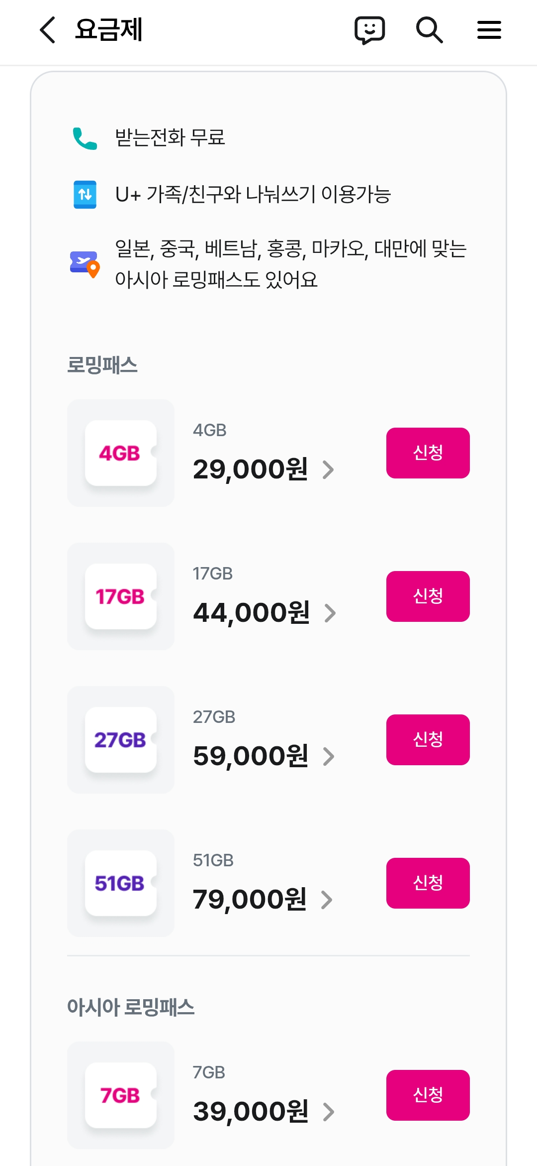 로밍패스 4기가 2,9000원/ 17기가 44,000원/ 27기가 59,000원/ 51기가 79,000원 /