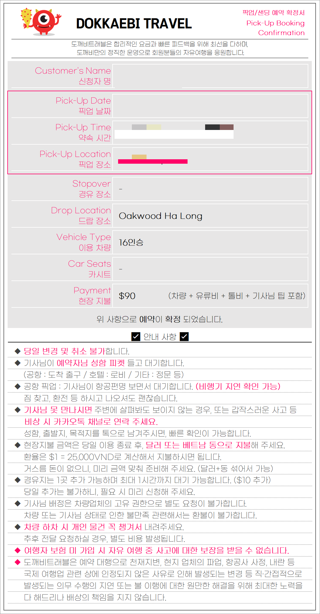하노이 도깨비에서는 노이바이국제공항에서 오크우드하롱까지 이동 금액 90달러였습니다.