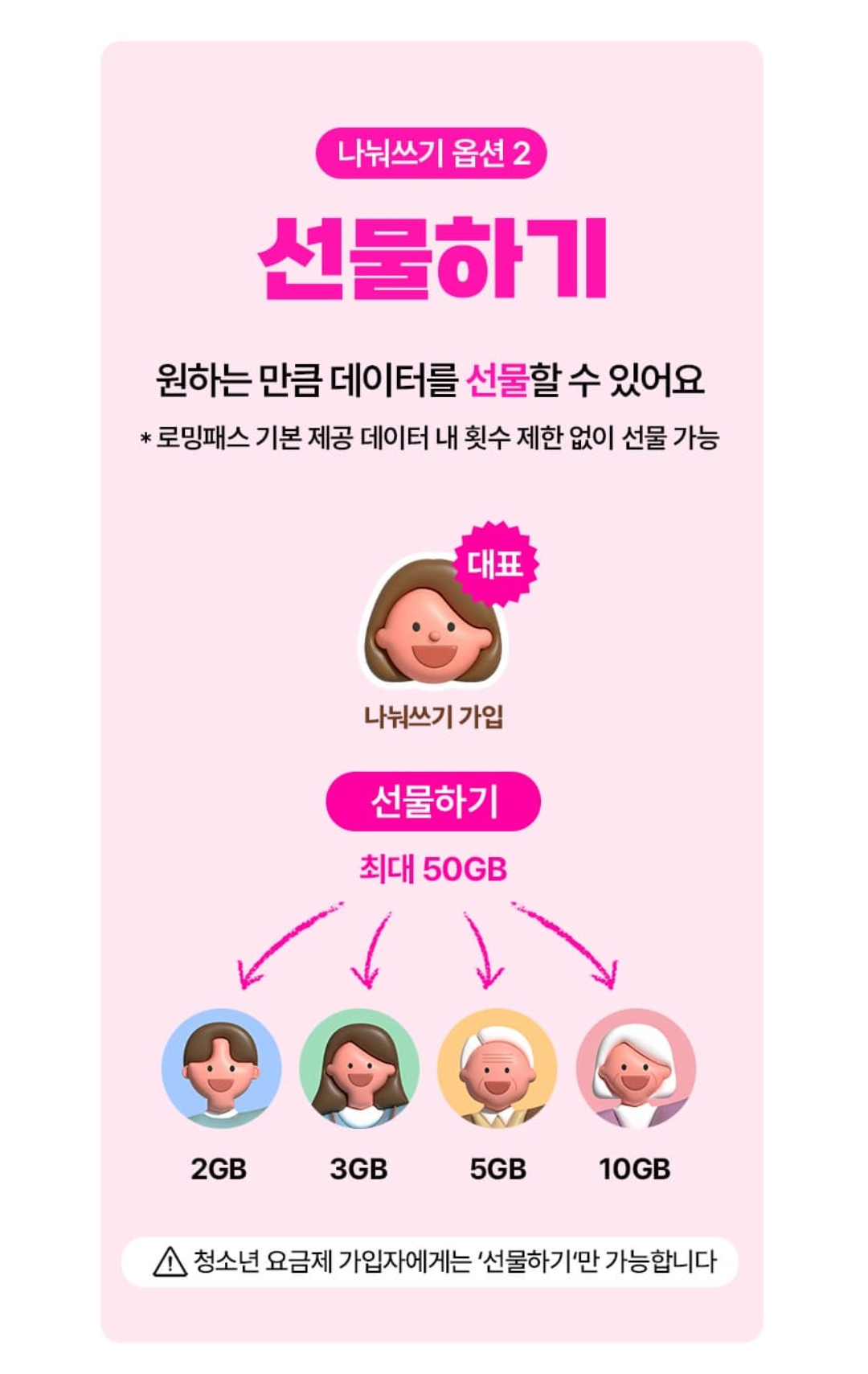 가입한 로밍상품 기본제공 데이터 내 횟수 제한 없이 원하는 만큼 데이터를 선물할 수 있습니다.