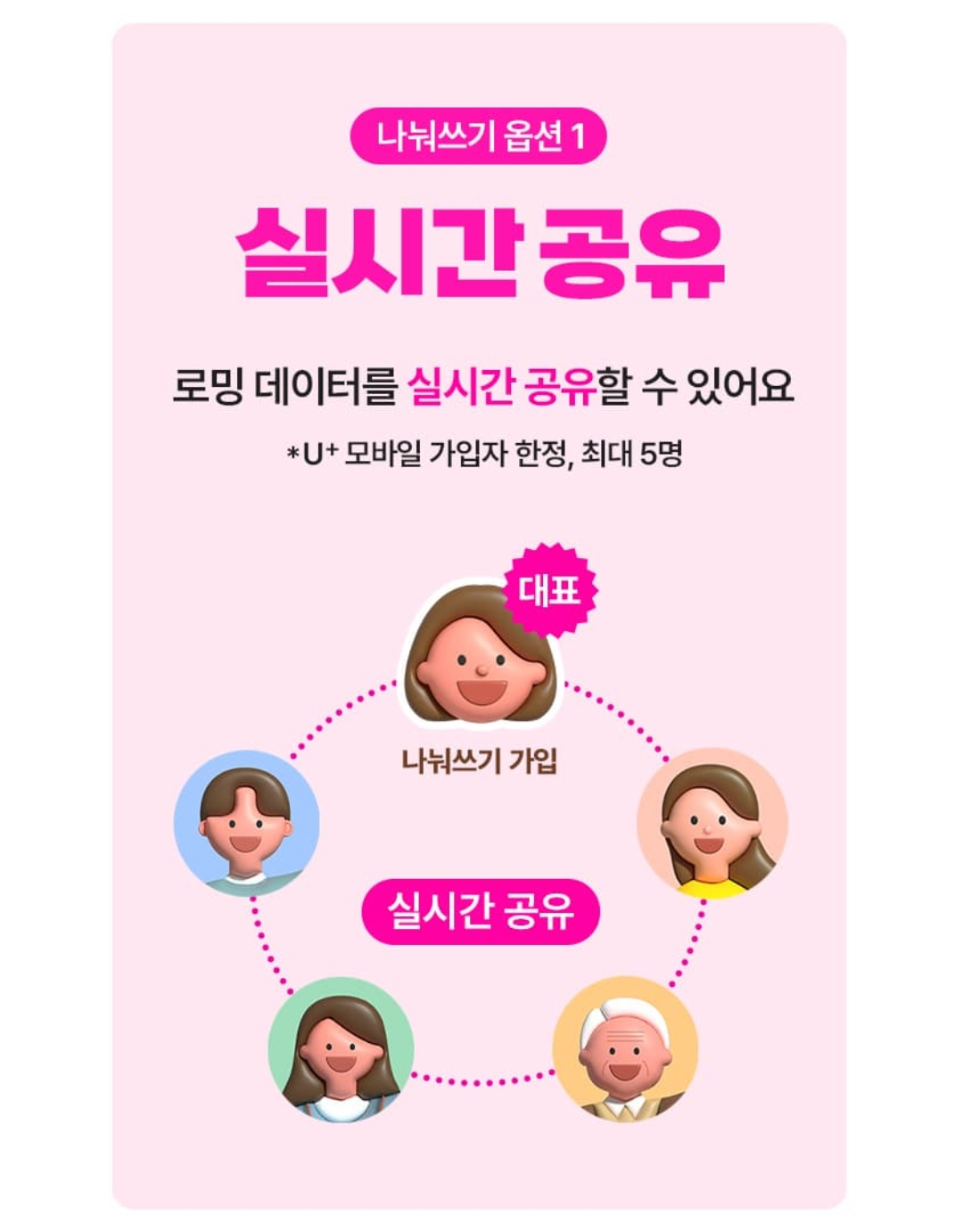 LG U+ 가입자라면 대표자 포함 최대 5명까지 데이터를 공유할 수 있습니다.