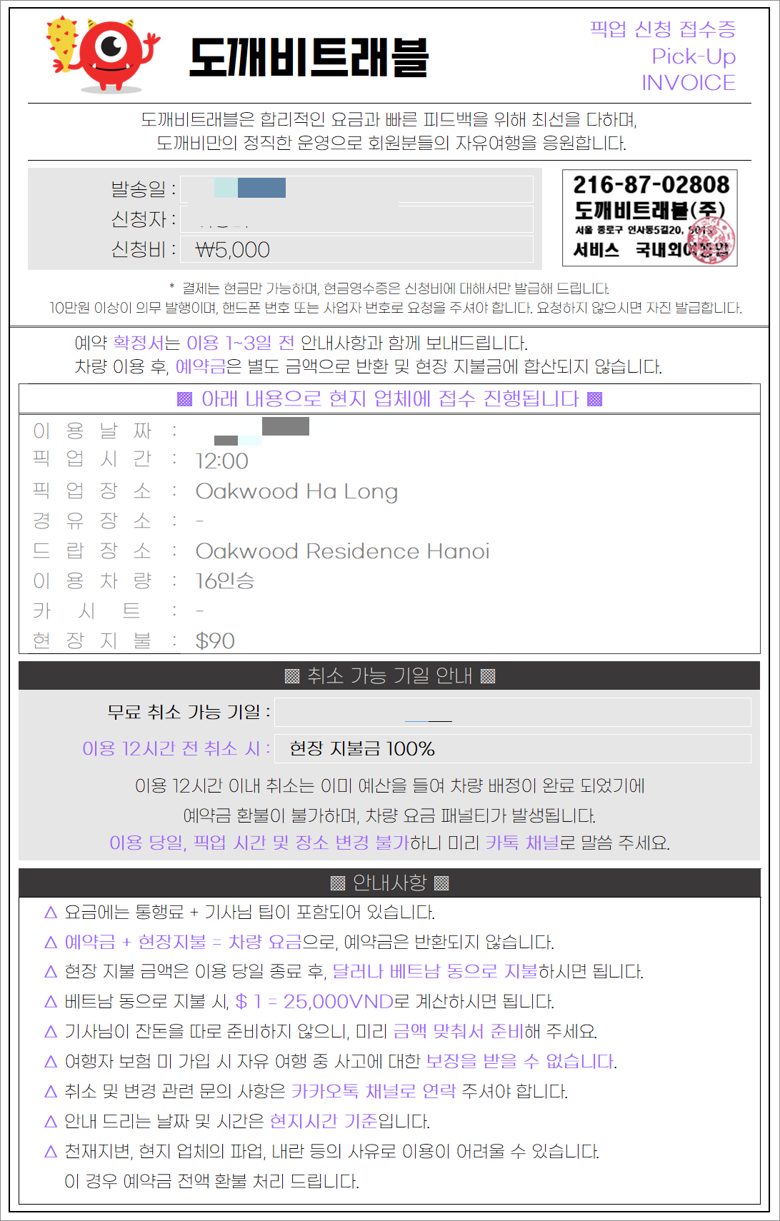 이용금액은 현장지불로 하셔야 하는데 이용종료 후, 달러나 베트남 동으로 지불하시면 됩니다.