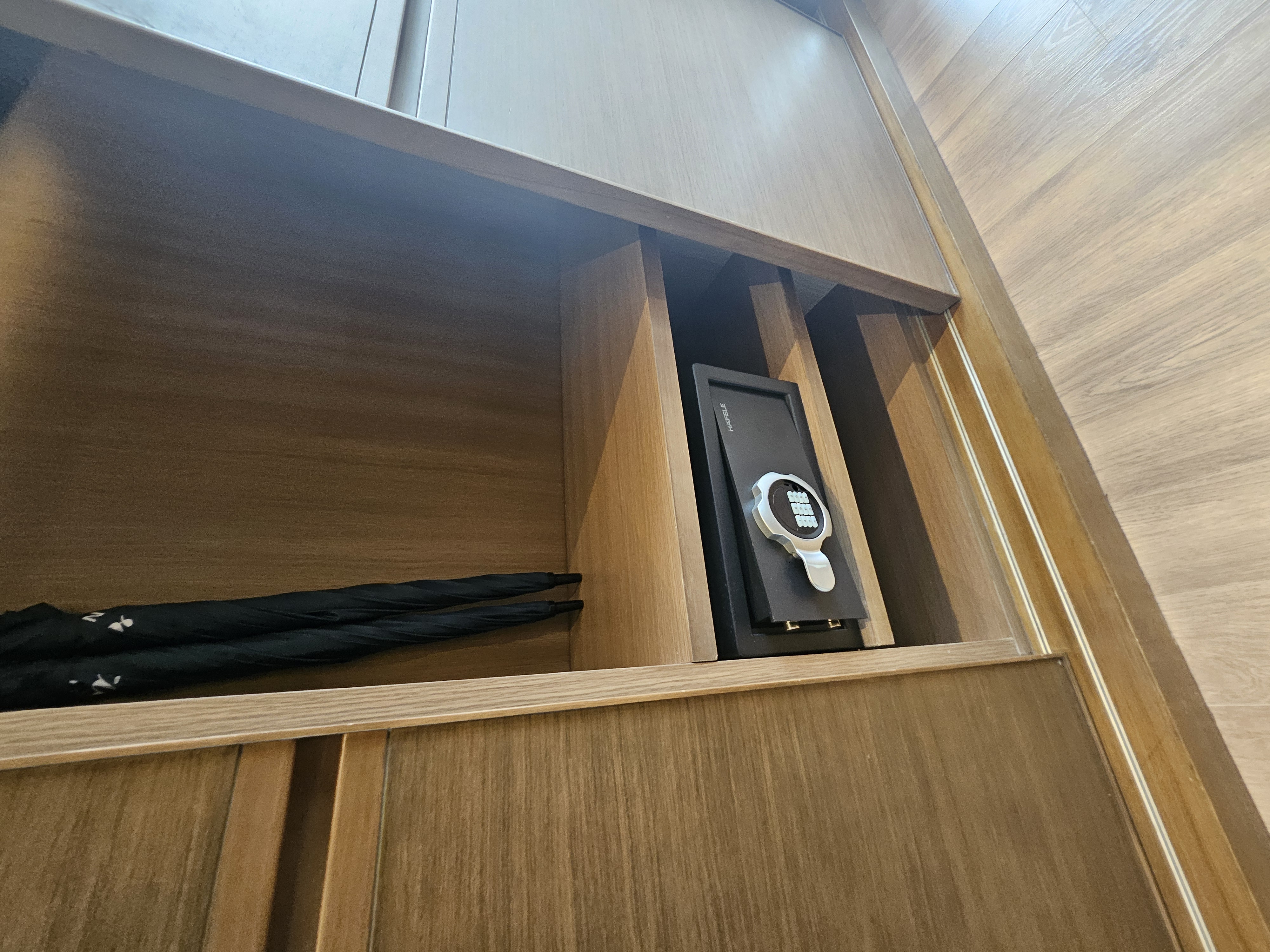 장우산 2개와 금고, 가운, 여분의 옷걸이, 신발이 들어 있습니다.