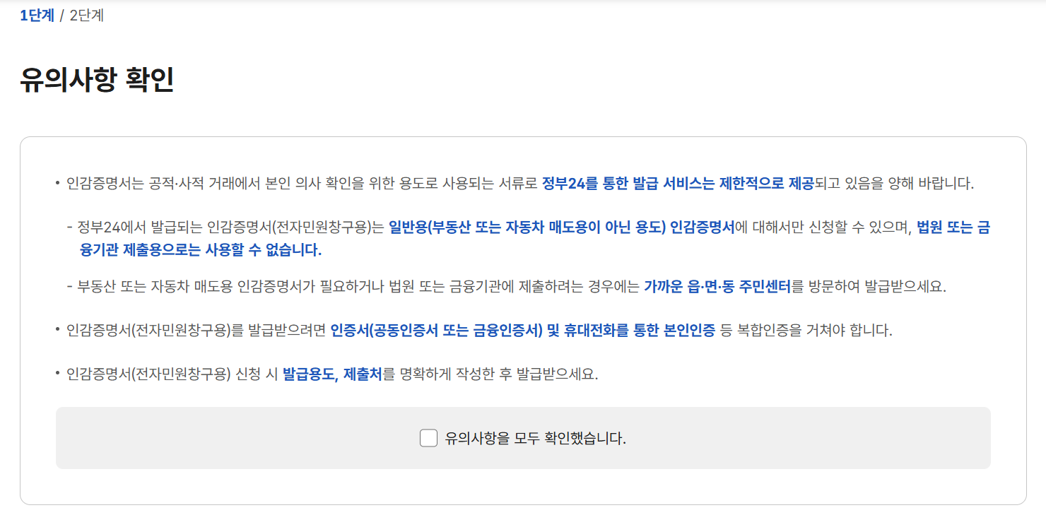 정부 24에서 발급되는 인감증명서는 부동산 또는 자동차 매도용이 아닌 용도, 법원 또는 금융기관 제출용이 아닌 용도로 일반용 인감증명서에 대해서만 신청할 수 있습니다.