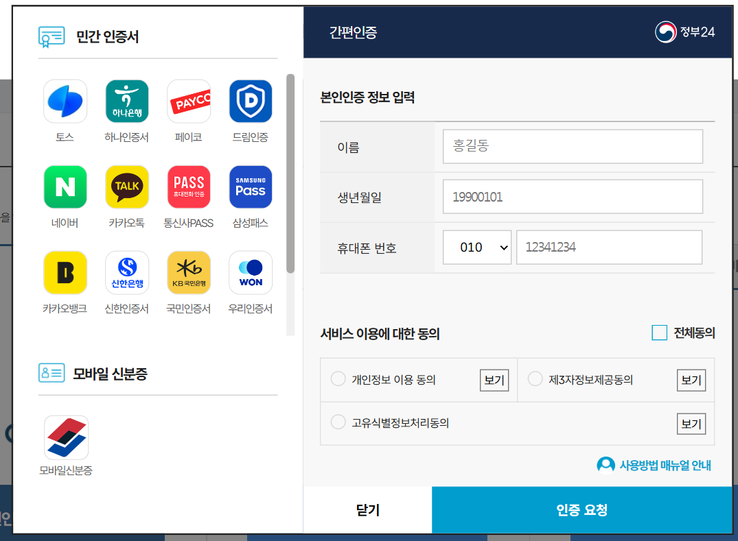 인감증명서를 발급받기 위해서는 공동인증서 또는 금융인증서와 휴대전화를 통한 본인인증을 거쳐야 합니다.