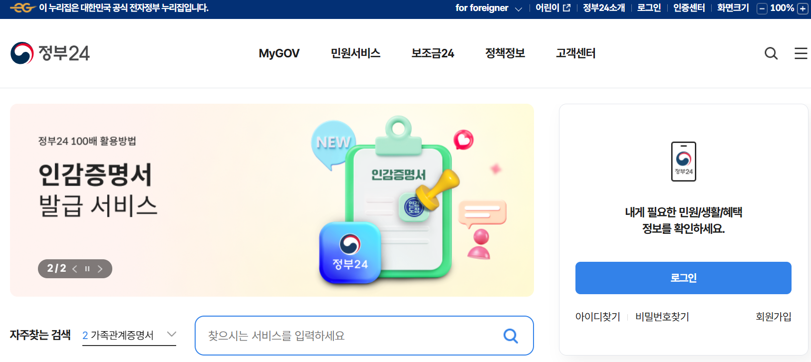 인감증명서 온라인 발급은 정부 24에서 가능합니다.