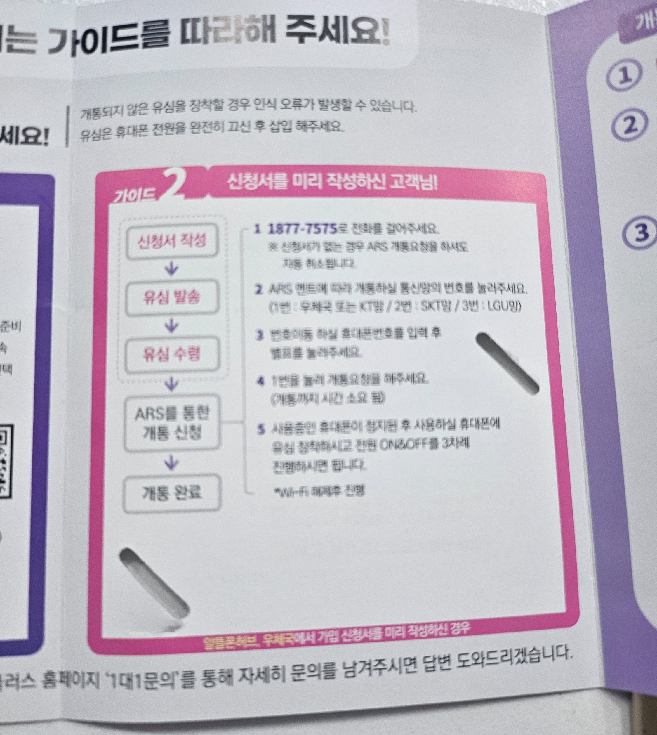우선 유심은 개통되기 전까지는 장착하지 말라고 하여