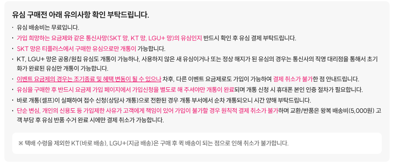 SKT는 유심 택배발송만 가능, 구입은 티플러스에서만!)