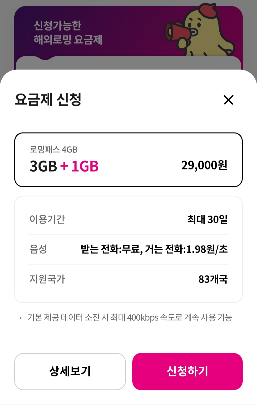 로밍패스 3기가+1기가를 선택하게 되면 요금은 30일간 29,000원입니다.
