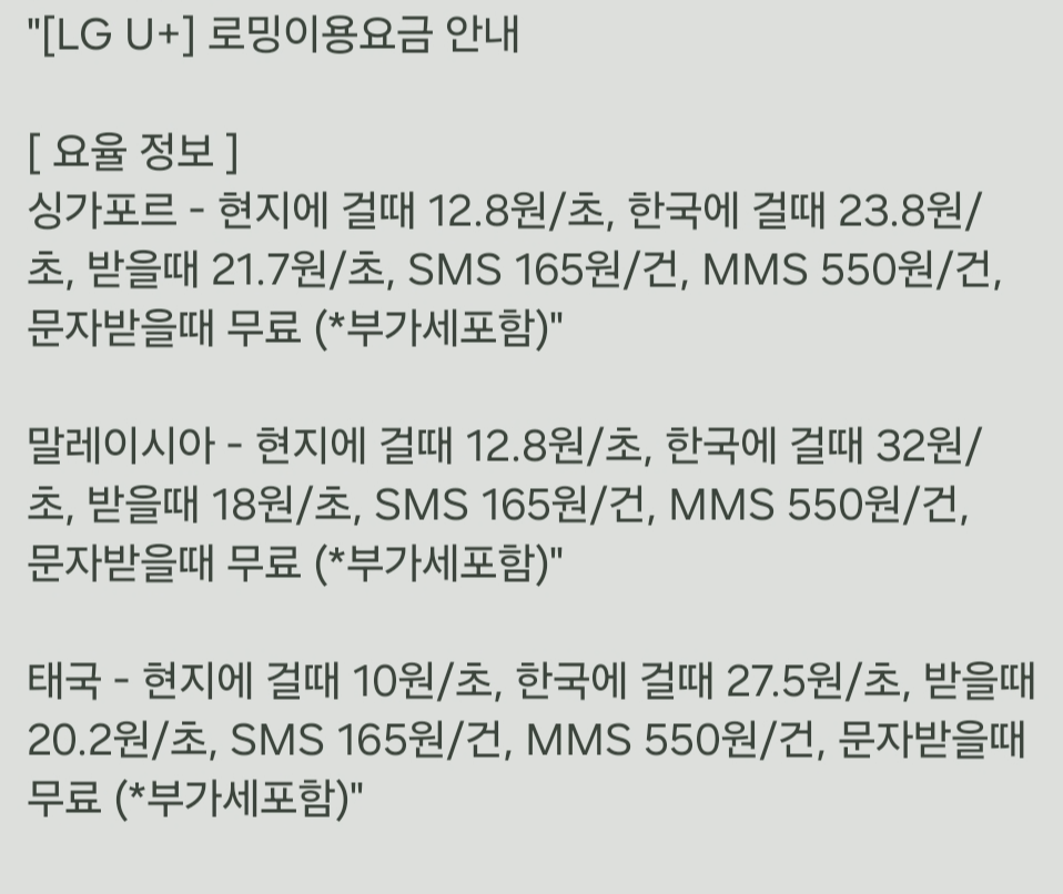 싱가포르, 말레이시아, 태국 로밍 이용 요금은?