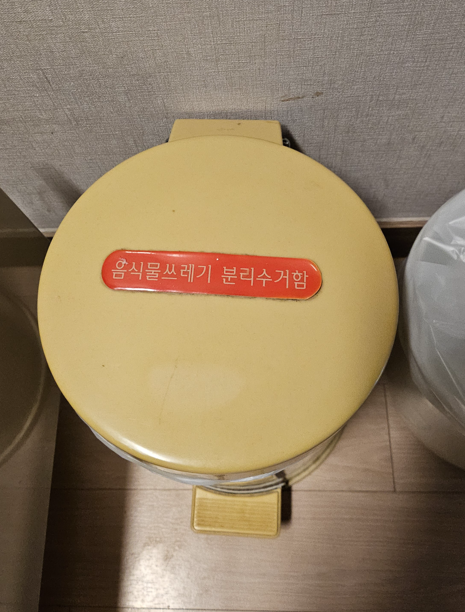 음식물쓰레기 분리수거함과 일반 쓰레기 휴지통이 있습니다.