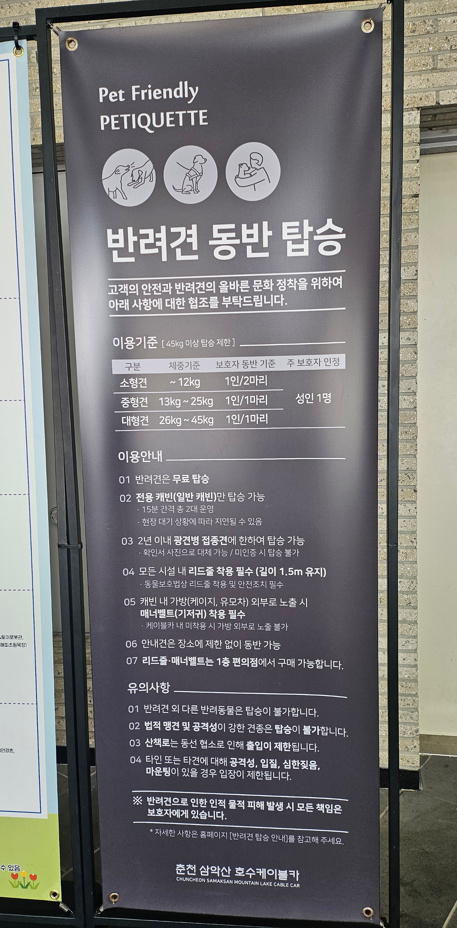 2년 이내 광견병 접종견에 한하여 탑승 가능하며 모든 시설 내 리드줄 착용이 필수라고 합니다.