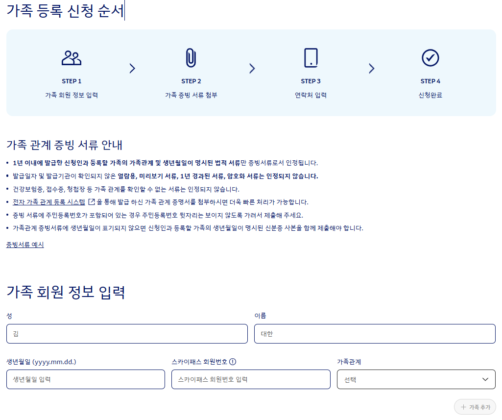 대한항공 스카이패스 계정에 가족 등록을 하기 위해서는 증빙서류가 필요합니다.