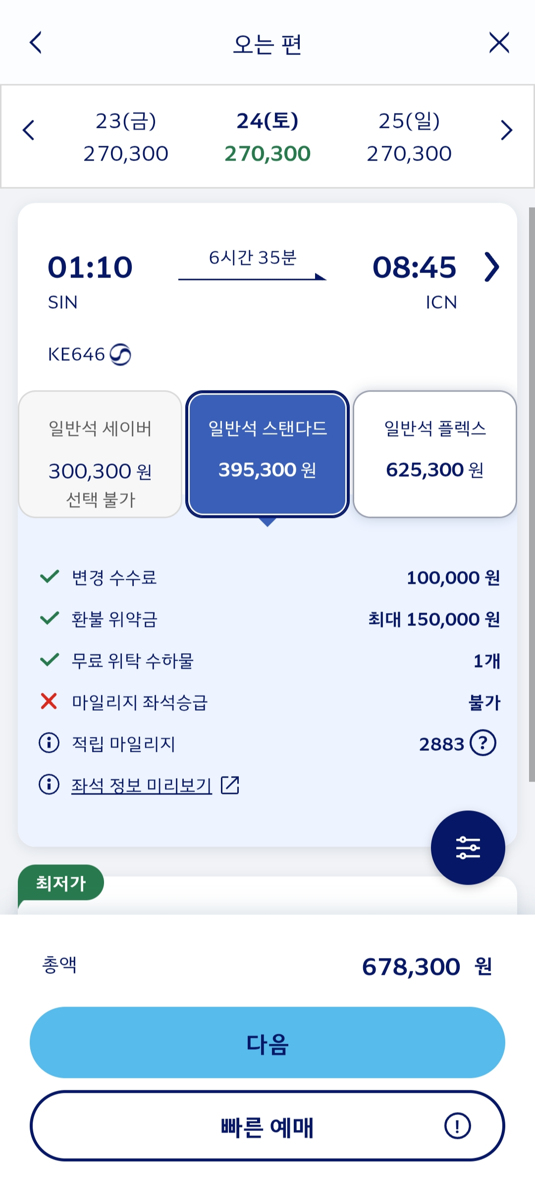 가는 편과 오는 편을 각 각 선택하여 '다음'을 클릭합니다.