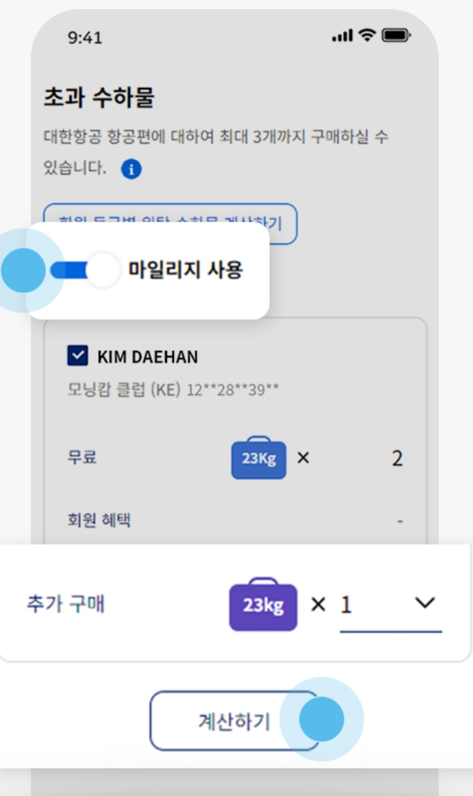 초과된 수하물을 마일리지로 결제하여 구매할 수 있습니다.