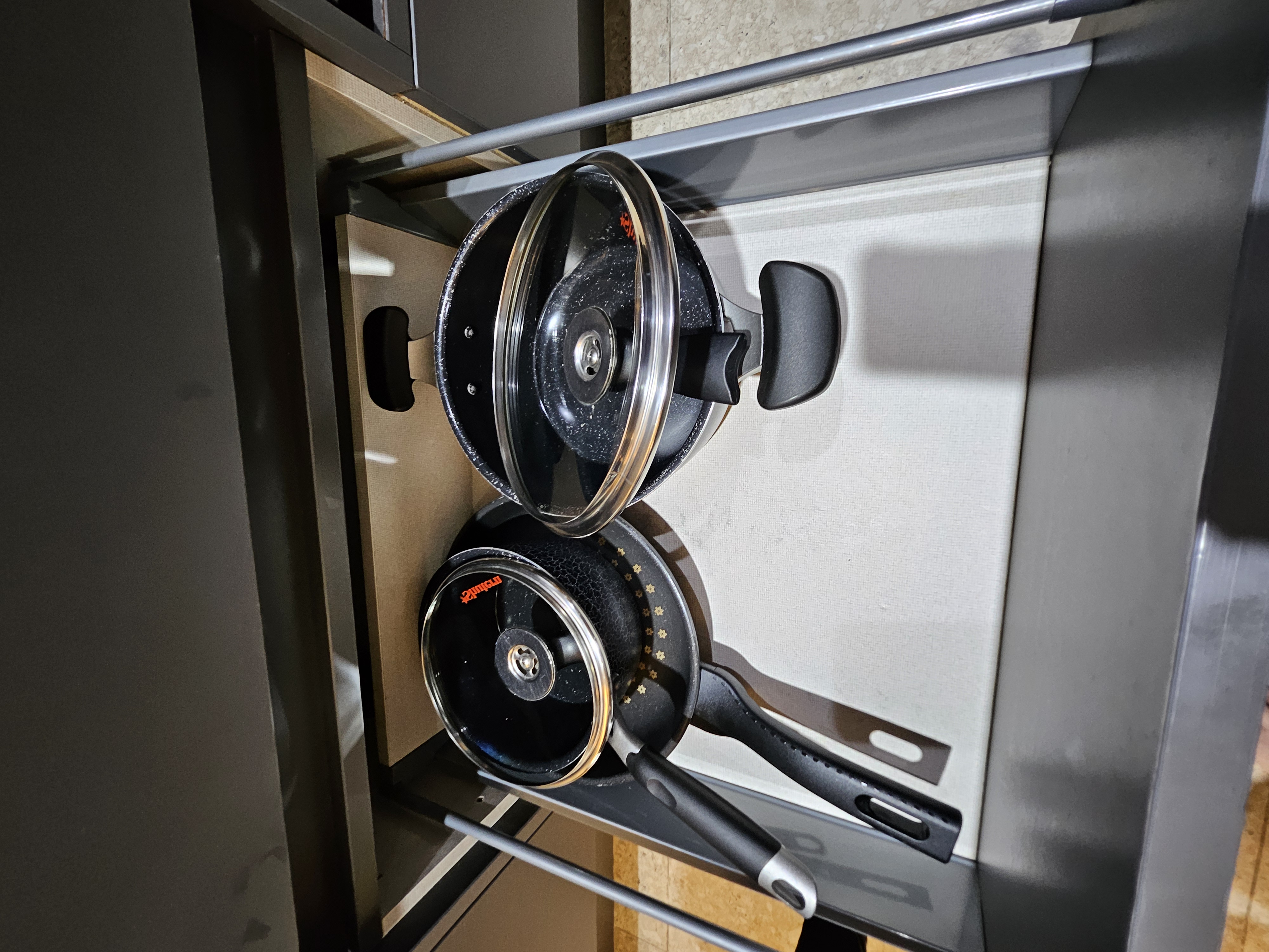 주방 하부장에는 냄비와 프라이팬, 전기밥솥, 4인기준에 맞는 식기, 칼, 주걱, 뒤집개 등과