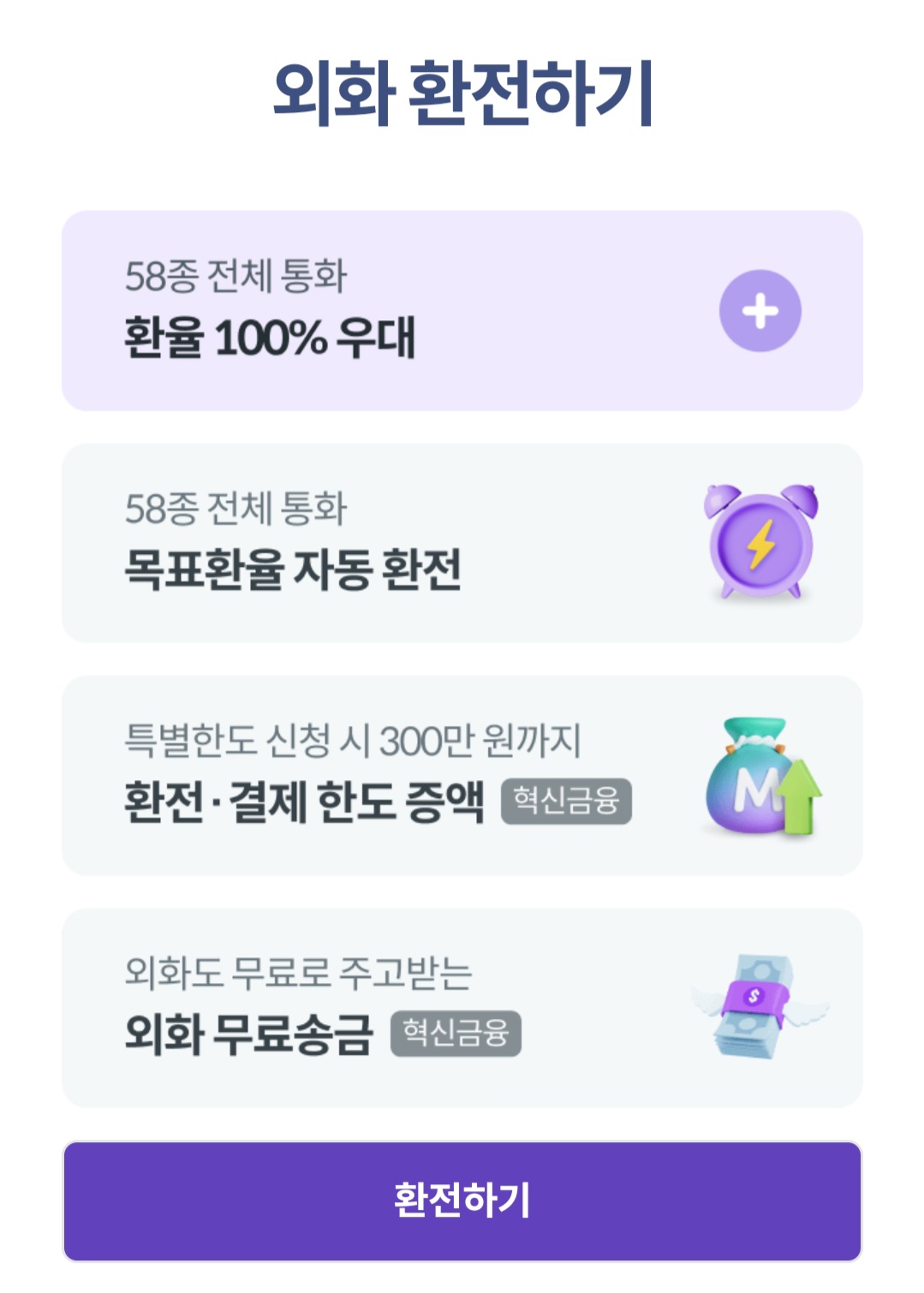 우선 58종 통화를 100% 우대하여 무료 환전이 가능합니다.