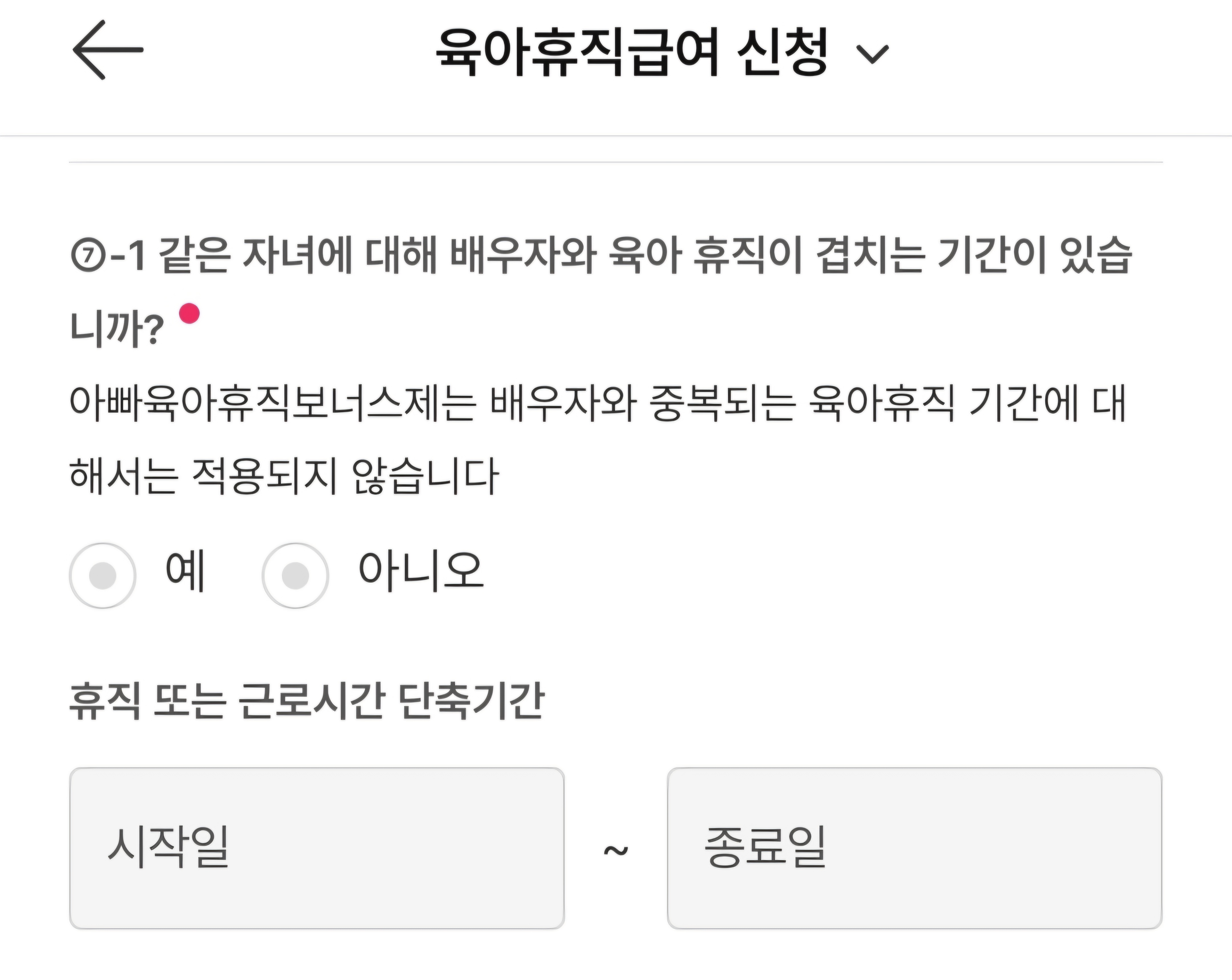 1번 질문인 '같은 자녀에 대해 신청인이 두번째 육아휴직입니까?'에 '아니요'로 체크했더니 아래 체크란들은 활성화되지 않아 넘어갔습니다.