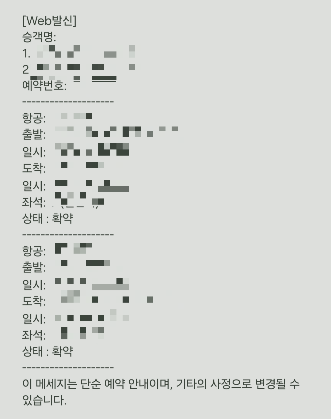 문자로 예약번호와 영문 승객명, 출발지와 도착지의 항공편명, 공항, 일시, 좌석 등을