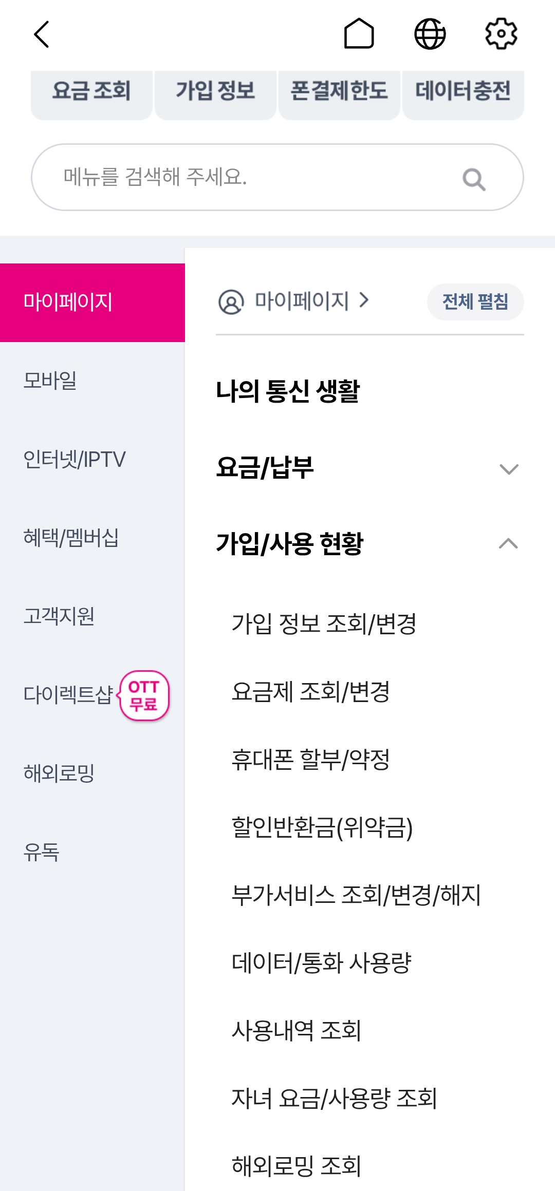 앱에서 마이페이지> 부가서비스 조회/ 변경/ 해지를 클릭합니다.