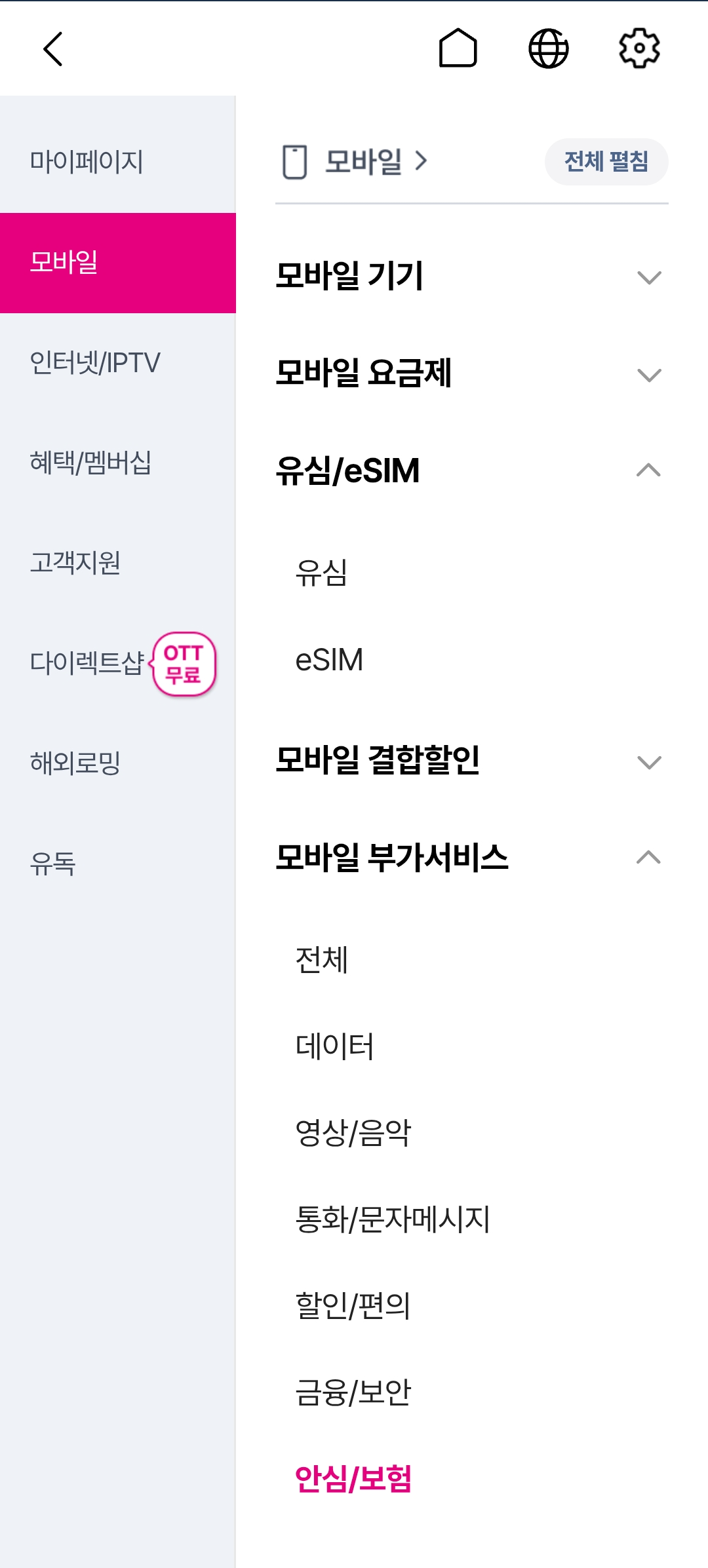 모바일→모바일 부가서비스 →안심/보험을 클릭합니다.