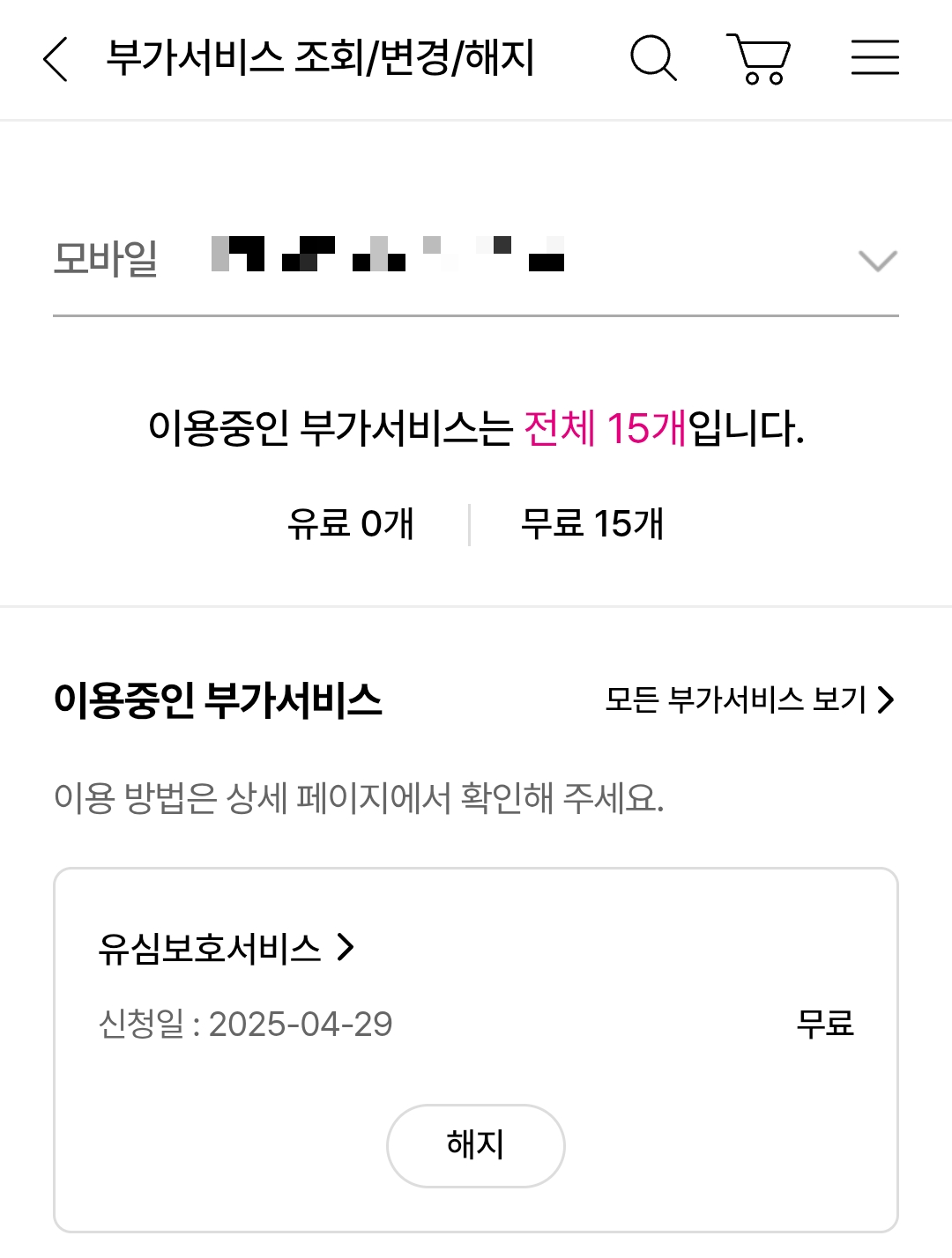 앱에서 마이페이지> 부가서비스 조회/ 변경/ 해지를 클릭합니다.