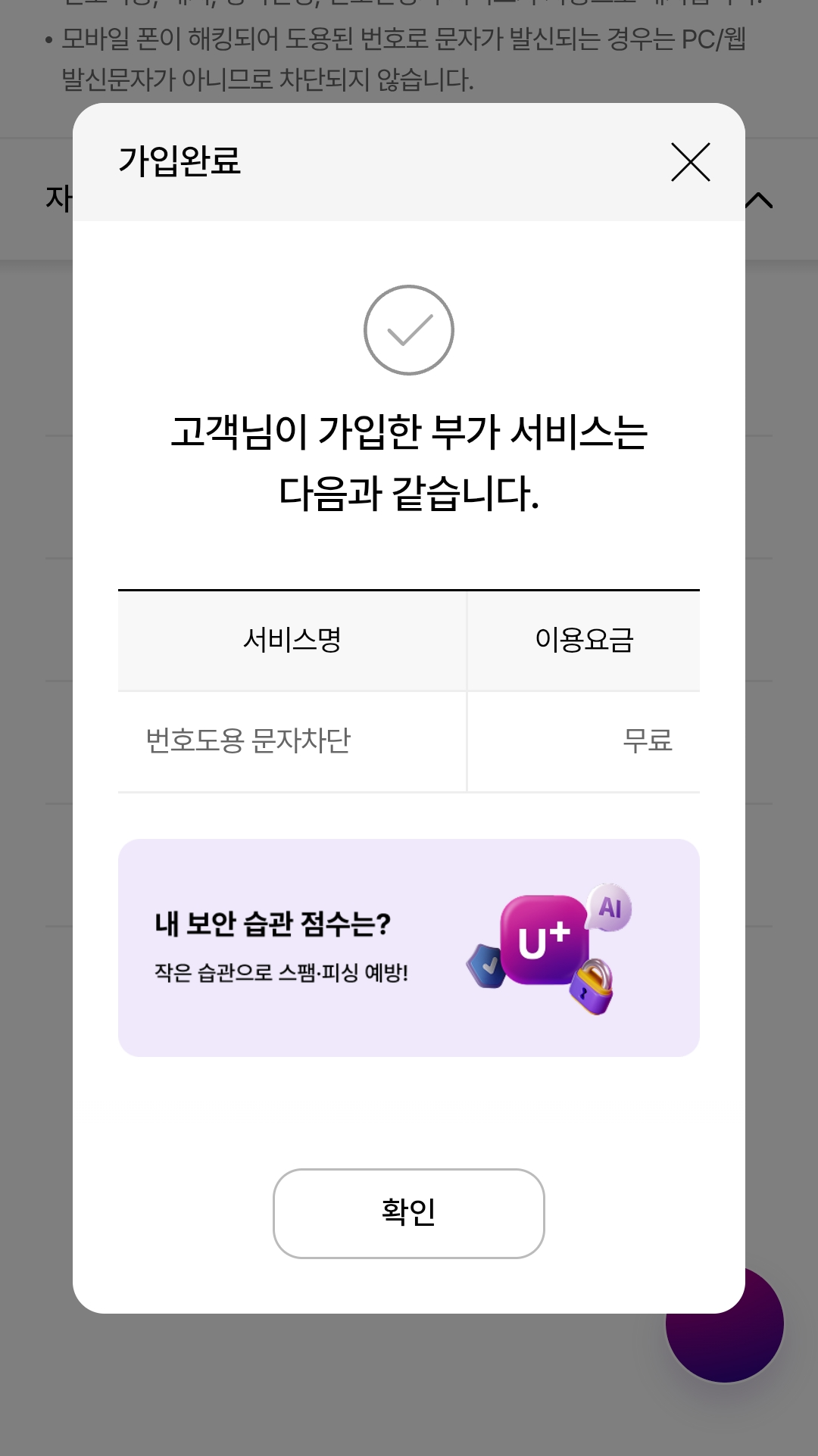 그럼 가입한 번호도용 문자차단 서비스에 가입이 완료됩니다.