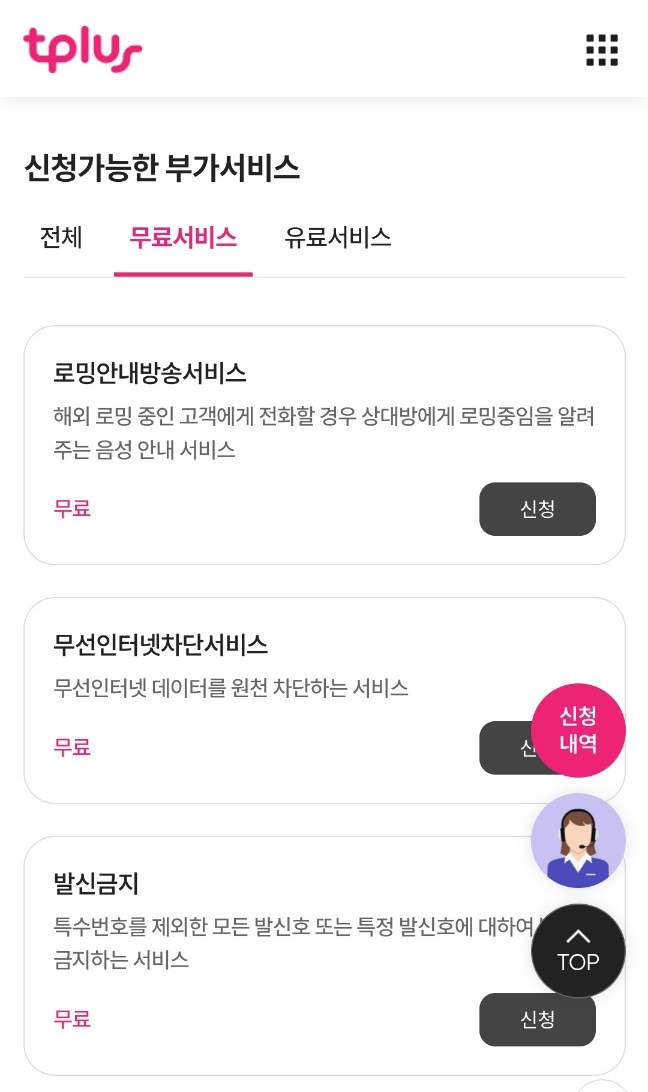 신청가능한 부가서비스 중 '무료'를 클릭하고