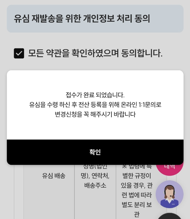 마지막으로 입력한 주소로 신청 접수 확인 메시지가 뜨면 '확인'을 클릭합니다.