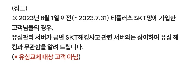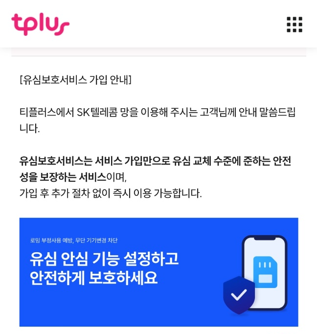 skt 해킹사태는 skt망을 사용하는 tplus 티플러스에게도 영향을 미쳤습니다.아이들의 휴대폰을 skt망의 tplus 티플러스를 쓰는데...유심보호서비스, 유심교체 신청등을 했었고신청한 지 한 달이 지나