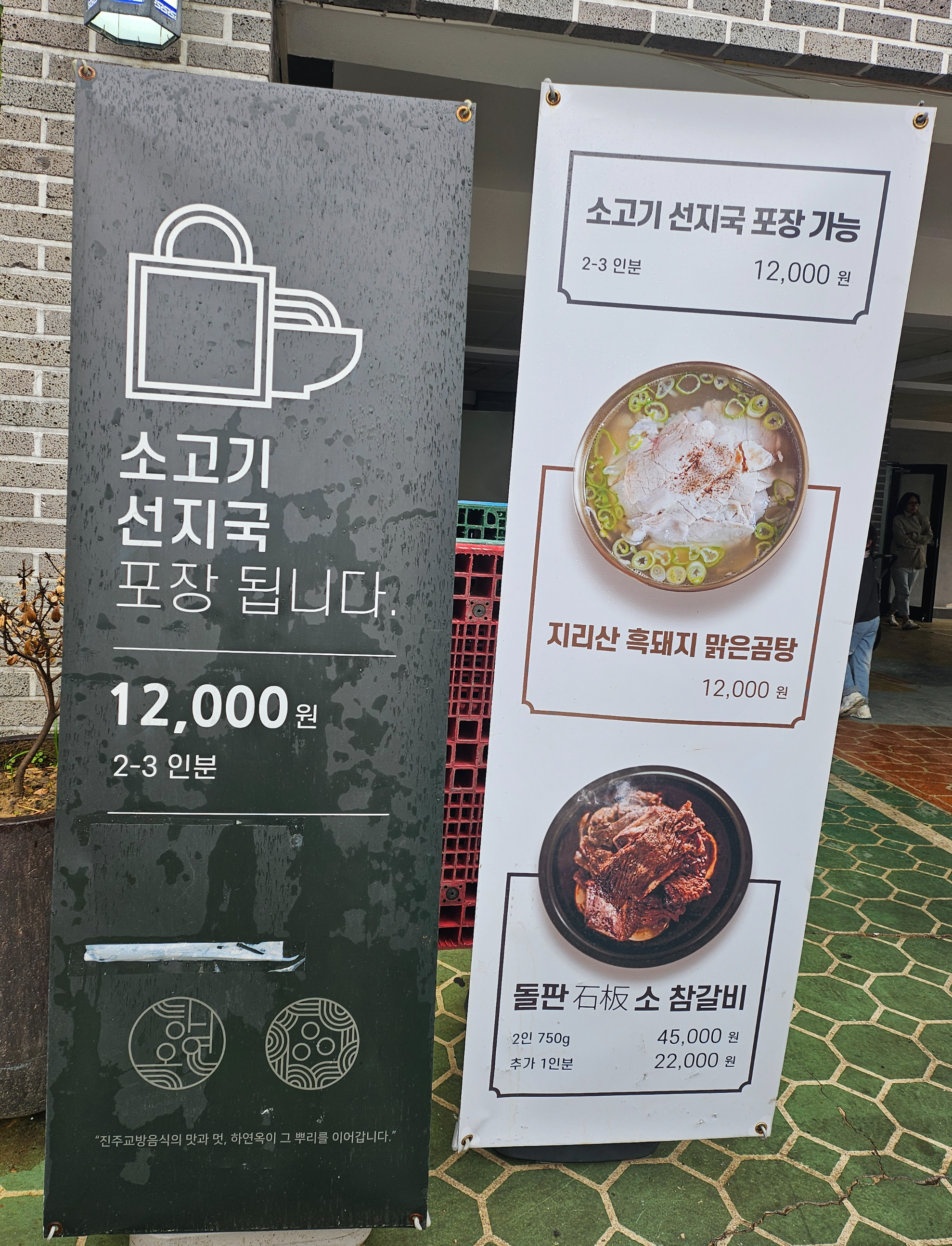 소선지국밥 11,000원, 지리산 흑돼지 맑은 곰탕 12,000원과