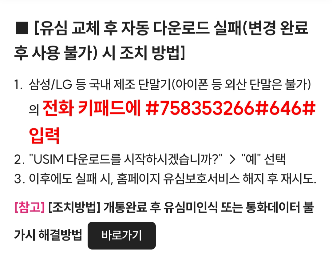 유심 교체 후 사용 불가 시 조치방법도 안내하고 있습니다.