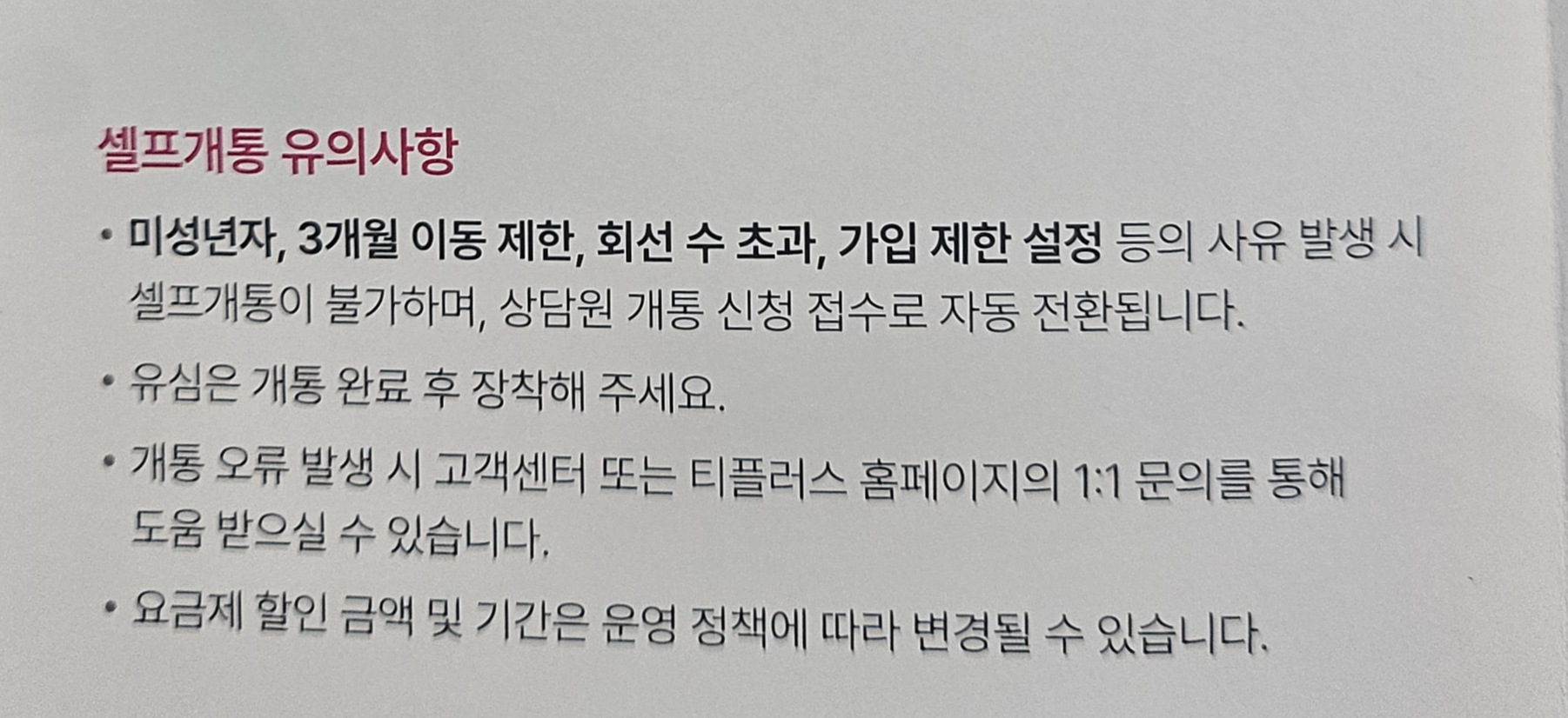 사유 발생 시 셀프개통이 불가하고