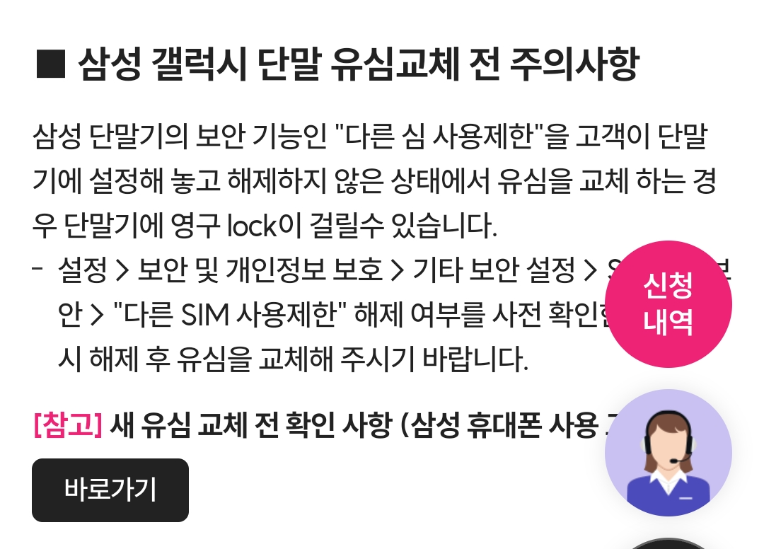 그리고 삼성 갤럭기 단말 유심교체 전 유의사항도 안내되고 있었습니다.