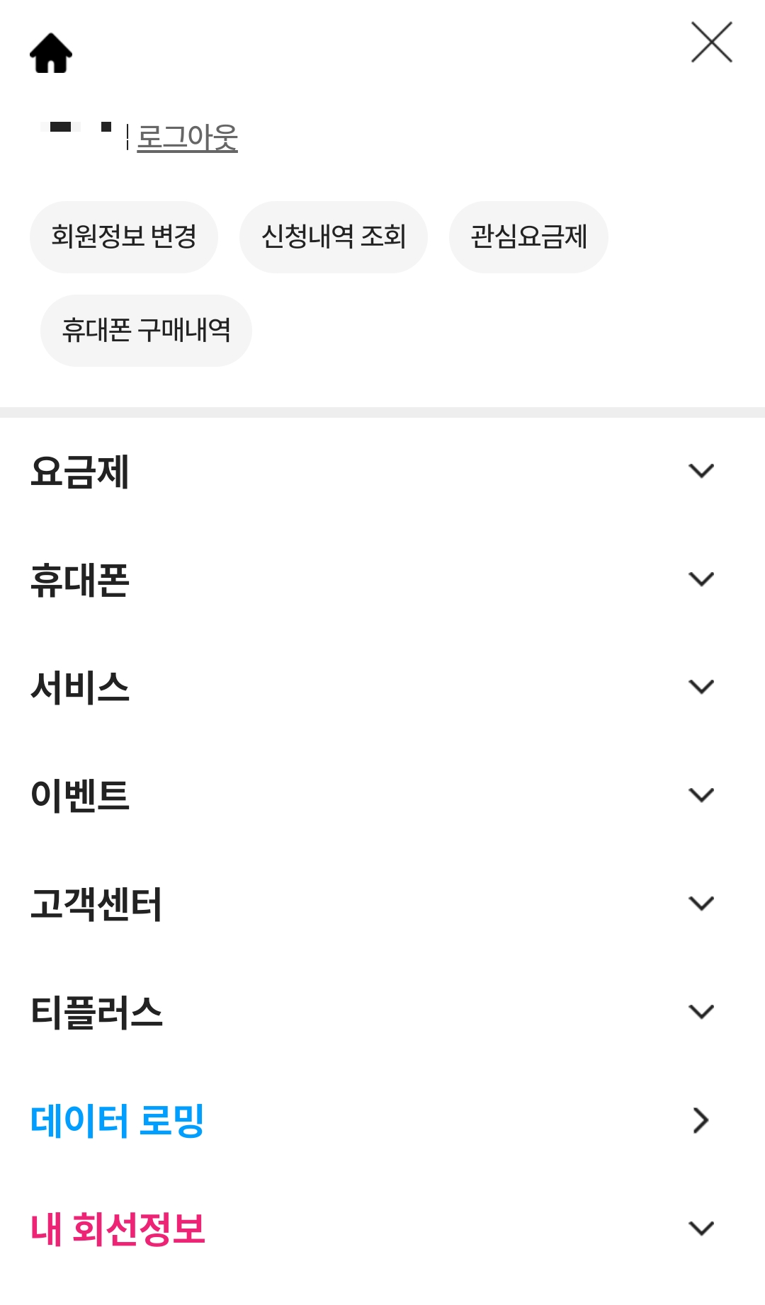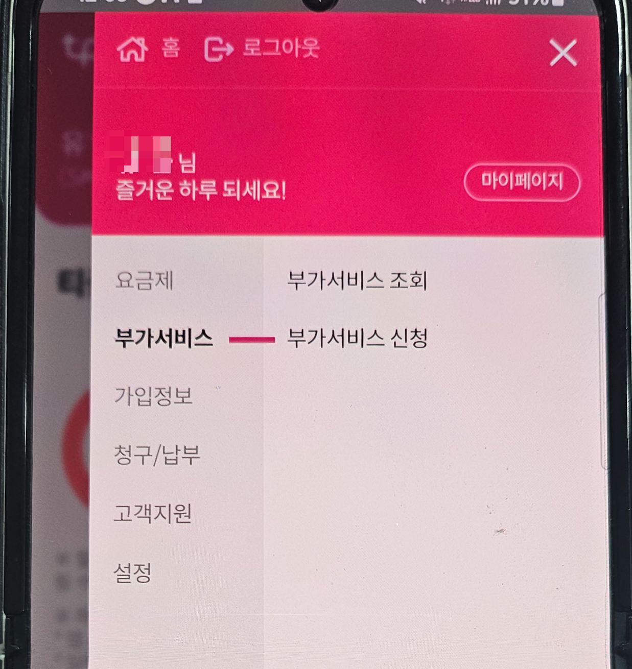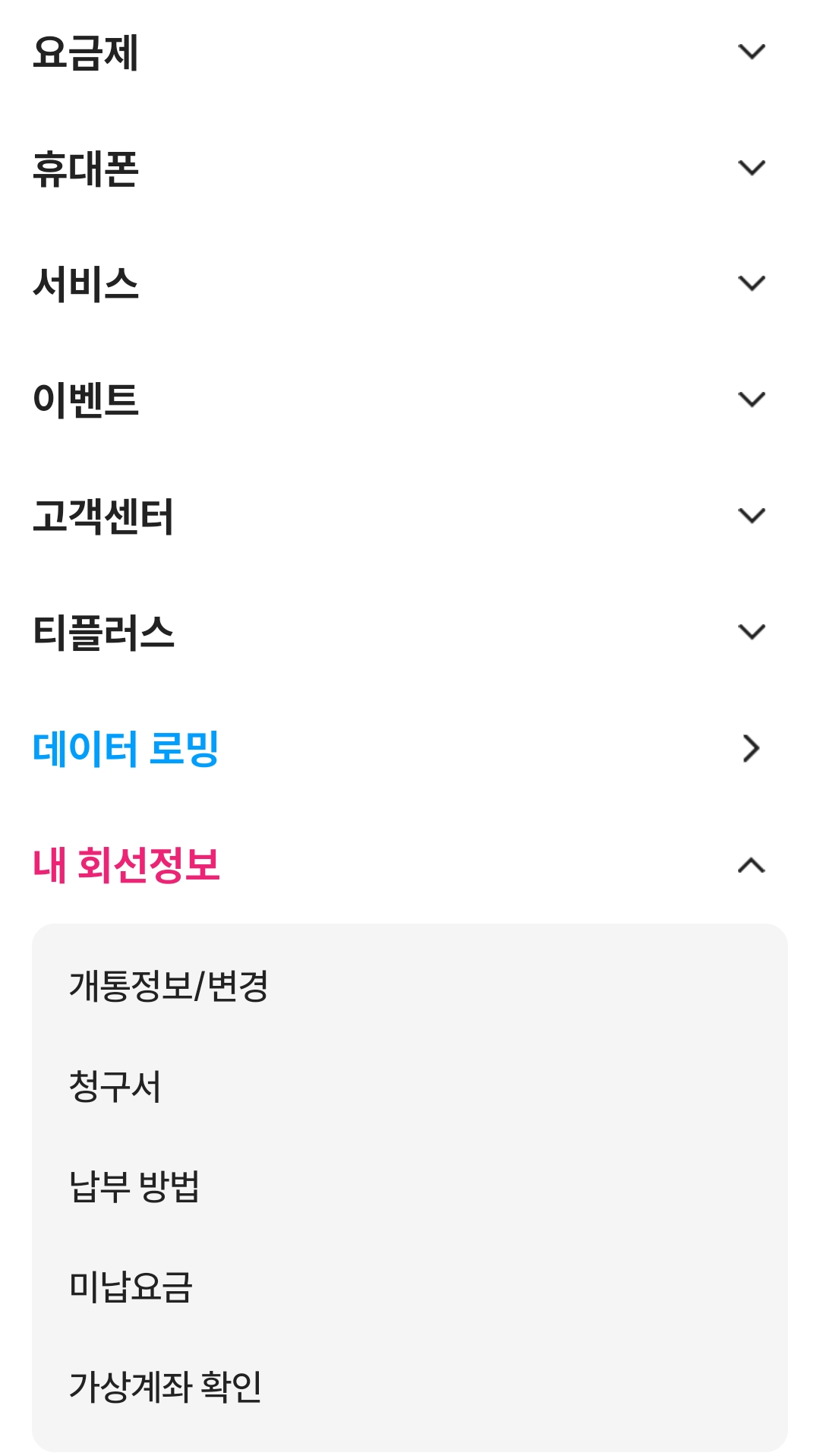 그럼 왼쪽에 요금제, 부가서비스, 가입정보, 청구/납부, 고객지원, 설정이 보이는데
