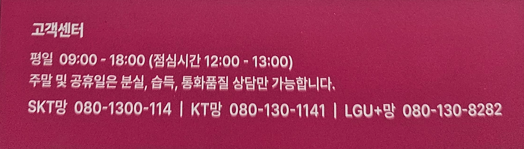 주말 및 공휴일은 분실, 습득, 통화품질 상담만 가능합니다.