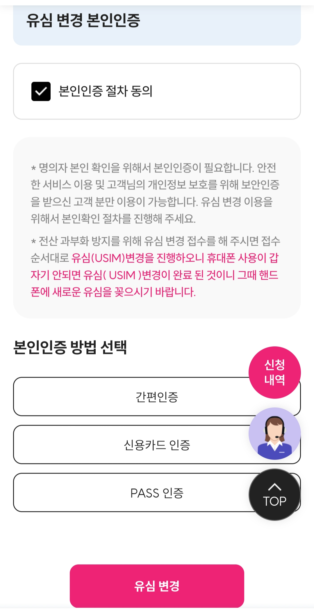 이후에도 실패 시에는 홈페이지 유심보호서비스 해지 후 재시도하시면 됩니다.