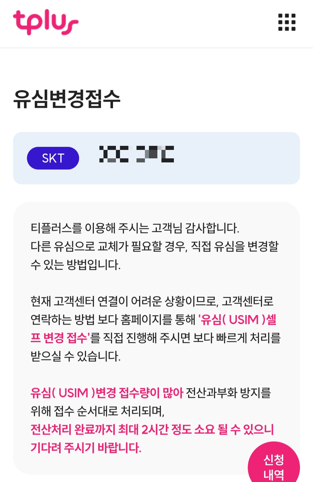 유심을 소지한 상태에서만 접수 가능합니다.