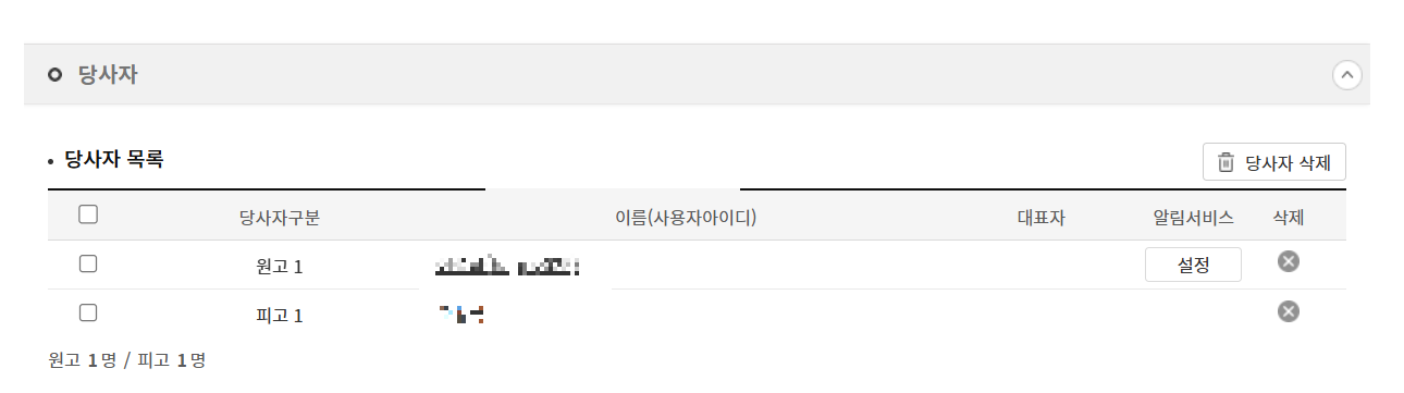 당사자목록에 원고와 피고의 정보가 뜨게 됩니다.