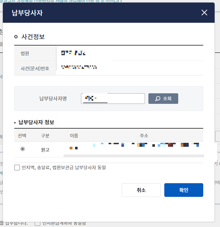 송달료도 금액과 납부당사자, 환급계좌를 입력하고