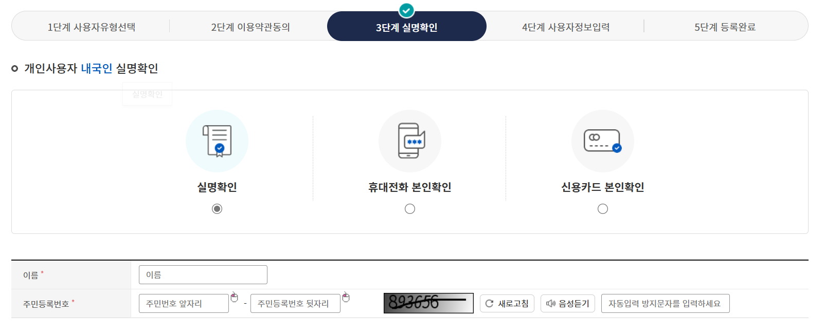 실명확인/휴대전화 본인확인/신용카드 본인확인 등을 통해 실명확인을 하고