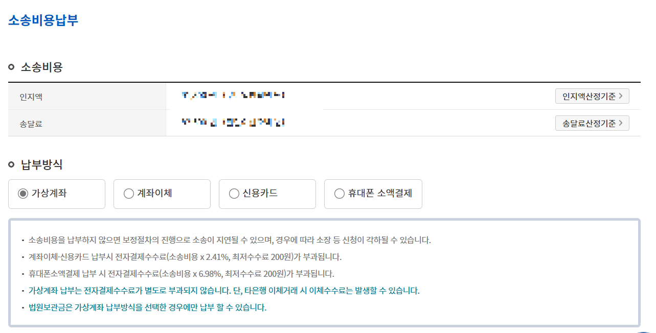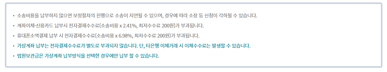 계좌이체와 신용카드 납부는 수수료 소송비용 ×2.14%로 최저수수료는 200원,