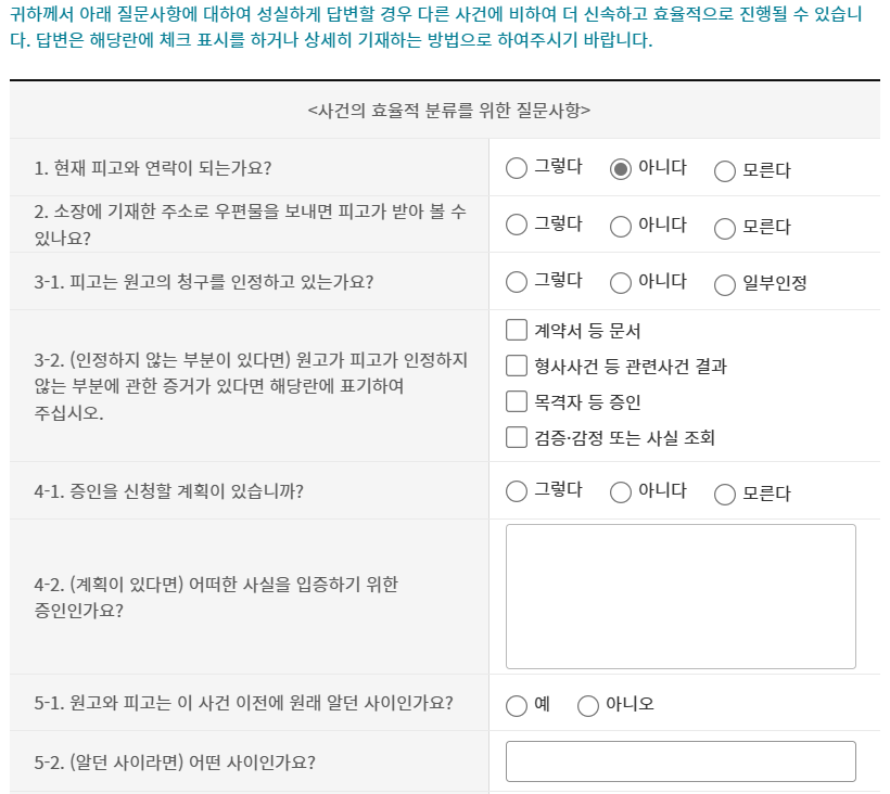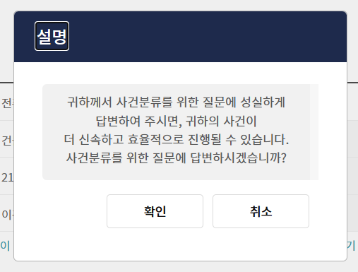 '귀하께서 사건분류를 위한 질문에 성실하게 답변하여 주시면,