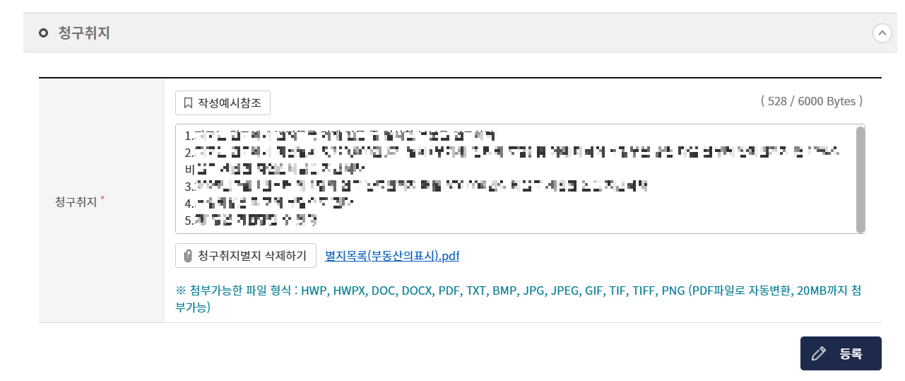 소재지, 건물명, 구분, 면적, 용도까지 적어 저장하신 후 파일을 첨부하시면 됩니다.