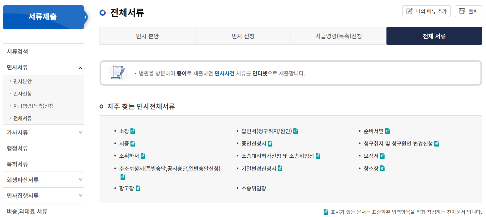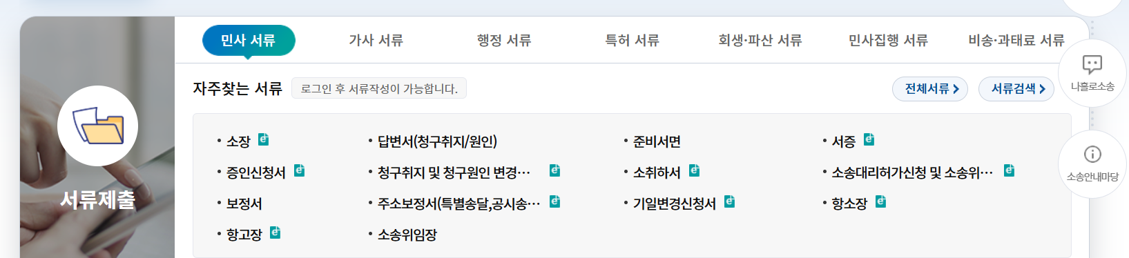 전체서류 중 민사서류를 클릭합니다.