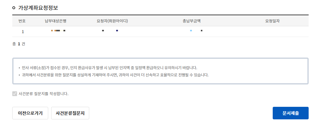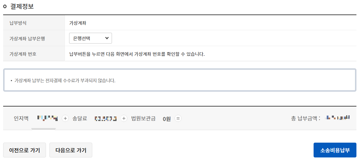 가상계좌를 선택하여 납부할 은행을 선택 후 '소송비용납부'를 클릭합니다.