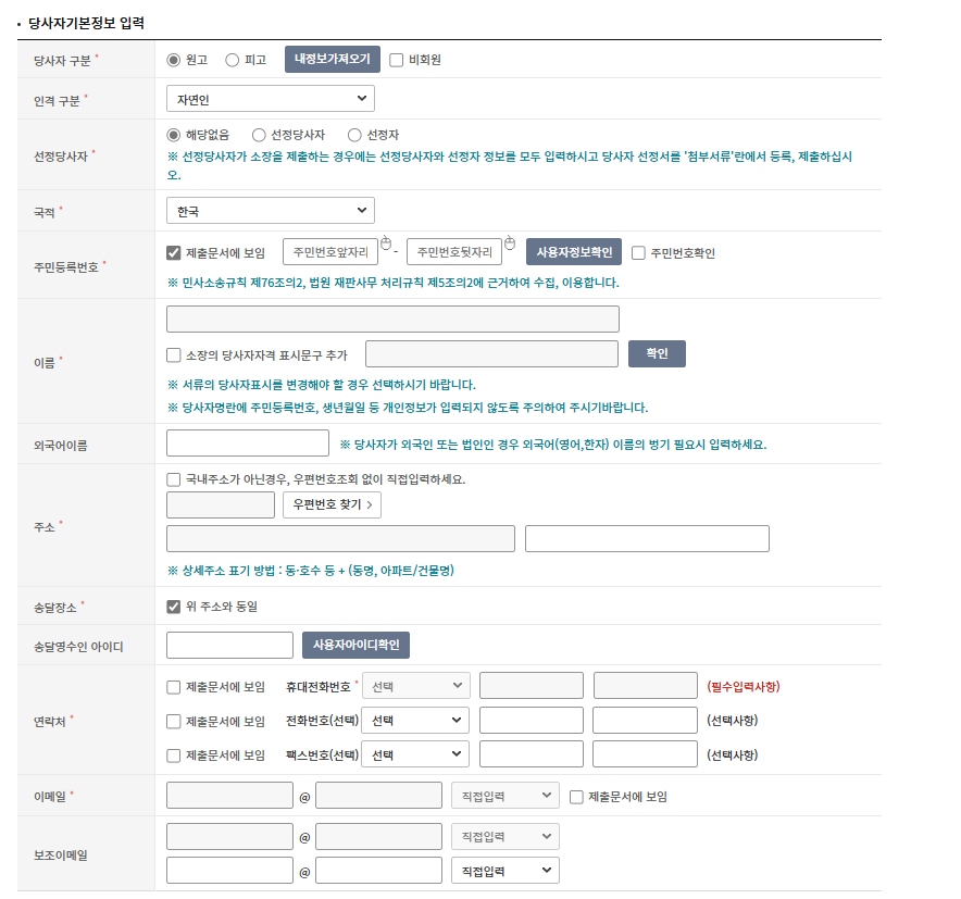 먼저 원고와 피고의 당사자 기본정보를 입력합니다.