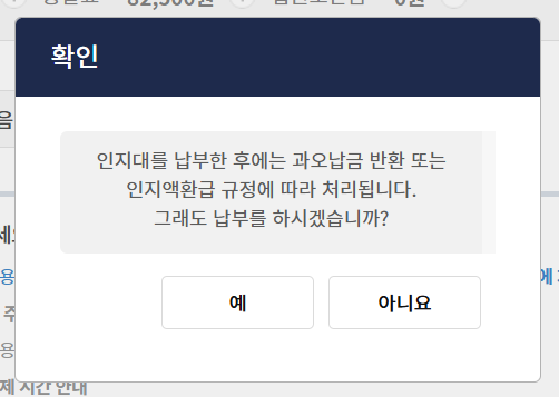 '인지대를 납부한 후에는 과오납금 반환 또는 인지액환급 규정에 따라 처리됩니다. 그래도 납부하시겠습니까?'
