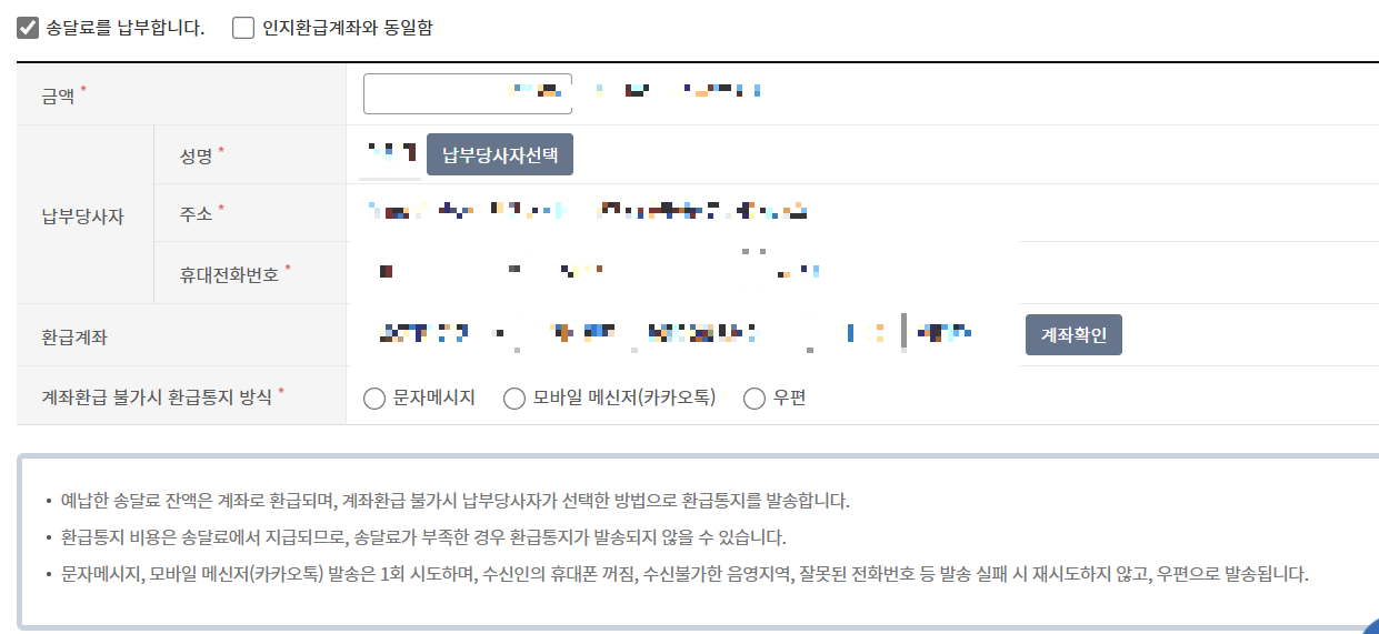 계좌환급 불가시 환급통지방식을 선택합니다.
