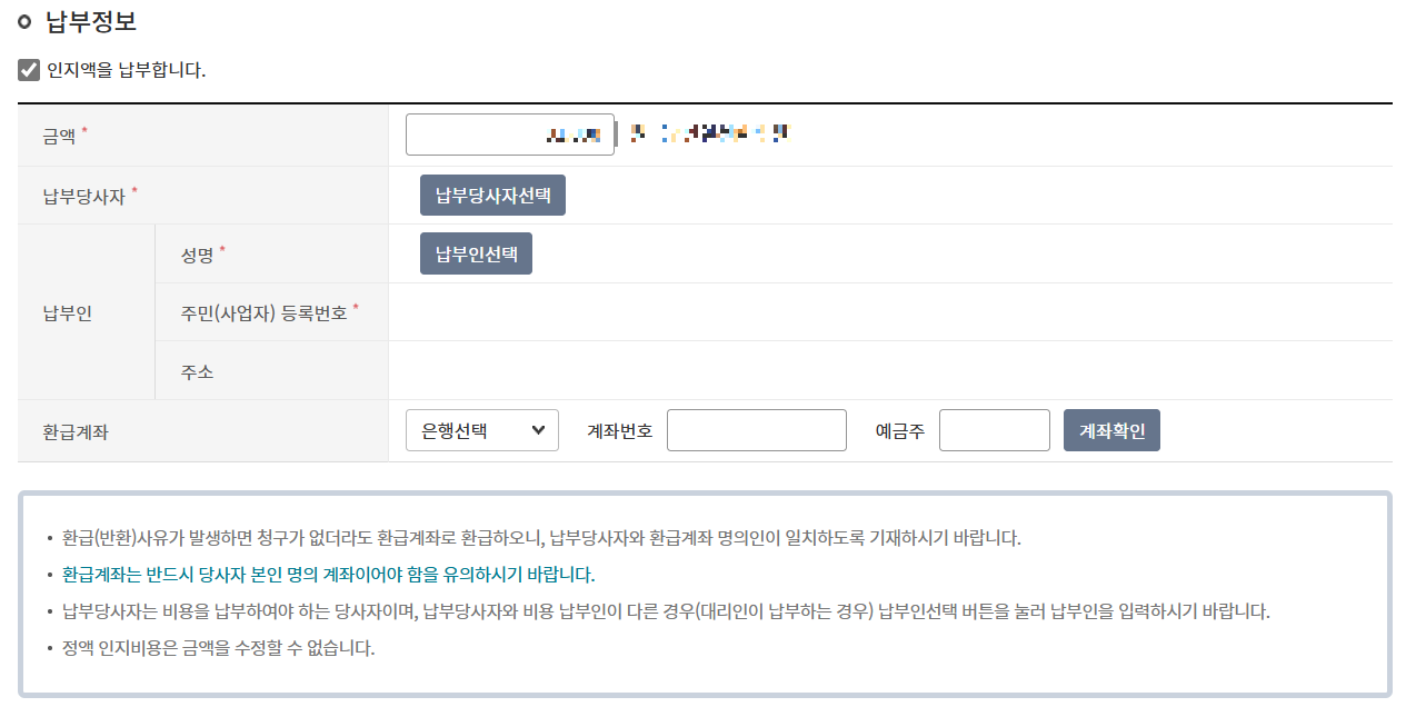 금액과 납부당사자, 납부인, 환급계좌를 적습니다.