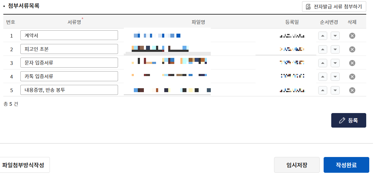 첨부서류를 등록하신 후 작성완료를 클릭합니다.